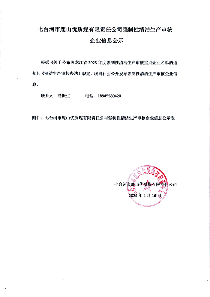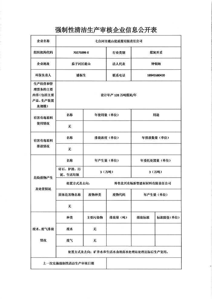 七臺河市鹿山優(yōu)質(zhì)煤有限責任公司強制性清潔生產(chǎn)審核企業(yè)信息公示